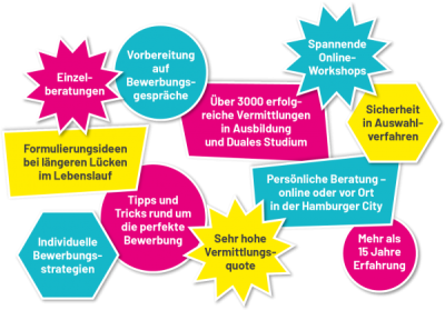 Wir unterstützen seit über 15 Jahren junge Menschen bei der Suche nach einem passenden Ausbildungs- oder Studienplatz. Dabei machen wir einen richtig guten Job: Das beweisen zufriedene Teilnehmer/-innen und unsere hohe Vermittlungsquote.